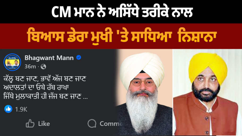 ਹਾਲਾਂਕਿ ਮੁੱਖ ਮੰਤਰੀ ਨੇ ਆਪਣੀ ਪੋਸਟ ‘ਚ ਕਿਸੇ ਦਾ ਸਿੱਧਾ ਨਾਂ ਨਹੀਂ ਲਿਆ, ਪਰ ਸੋਸ਼ਲ ਮੀਡੀਆ ‘ਤੇ ਇਸ ਪੋਸਟ ਨੂੰ ਡੇਰਾ ਬਿਆਸ ਮੁਖੀ ਨਾਲ ਜੋੜ ਕੇ ਦੇਖਿਆ ਜਾ ਰਿਹਾ ਹੈ। ਚਰਚਾ ਹੈ ਕਿ ਮੁਖ ਮੰਤਰੀ ਨੇ ਅਸਿੱਧੇ ਤੌਰ ‘ਤੇ ਡੇਰਾ ਬਿਆਸ ਮੁਖੀ ਨੂੰ ਨਿਸ਼ਾਨੇ ‘ਤੇ ਲਿਆ ਹੈ।